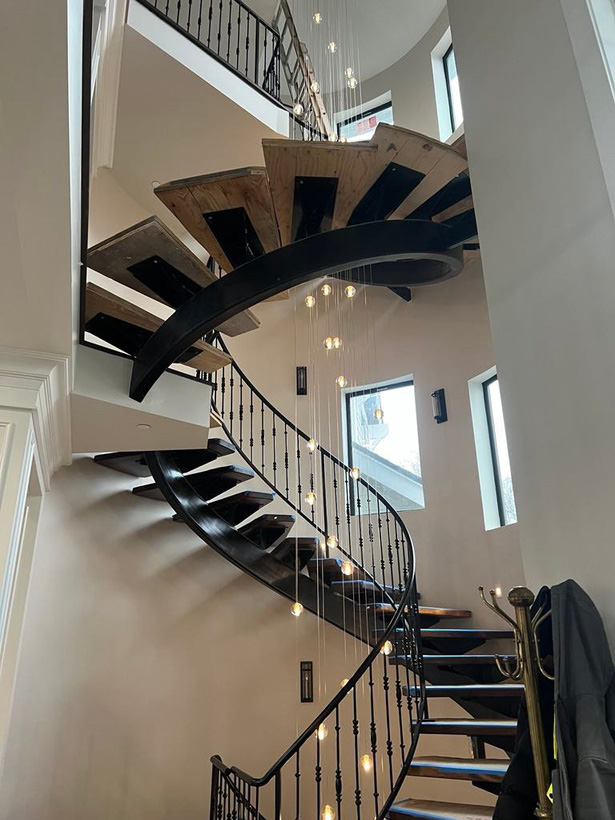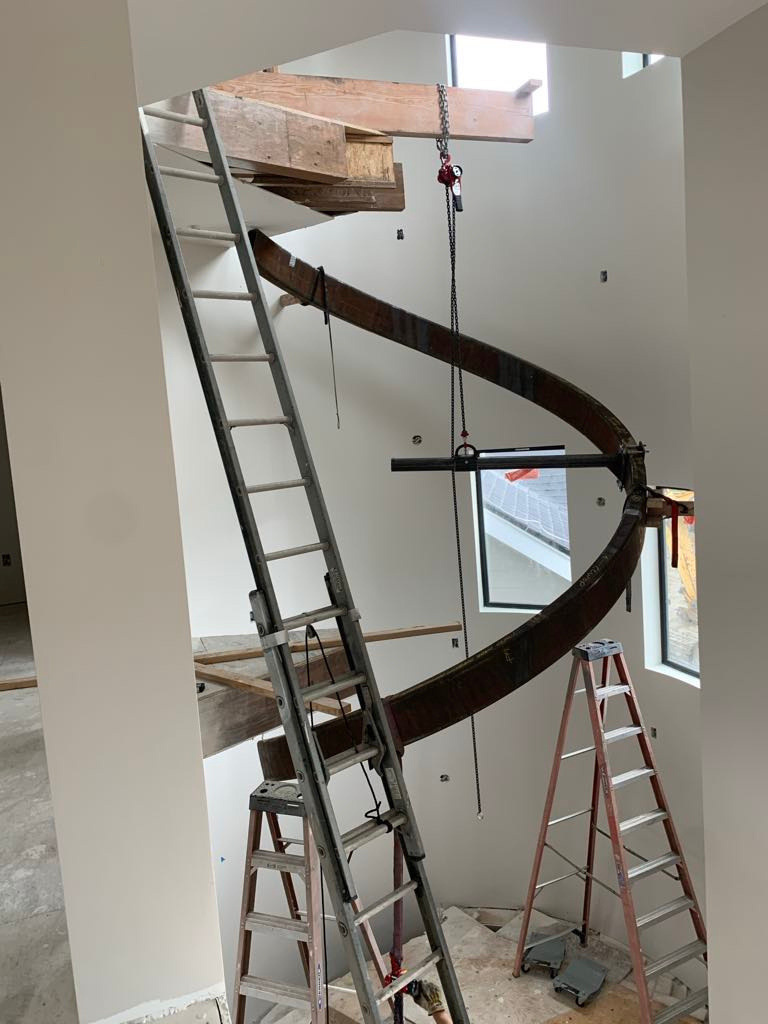 This custom staircase was designed and built by Morris Malone for a custom residential home in Puyallup, WA. Cade collaborated closely with Morris throughout the entire process, from design to installation. Additionally, Cade worked directly with the client to source the materials, including the unique stair treads made from parota wood, found in the jungles of Puerto Vallarta.